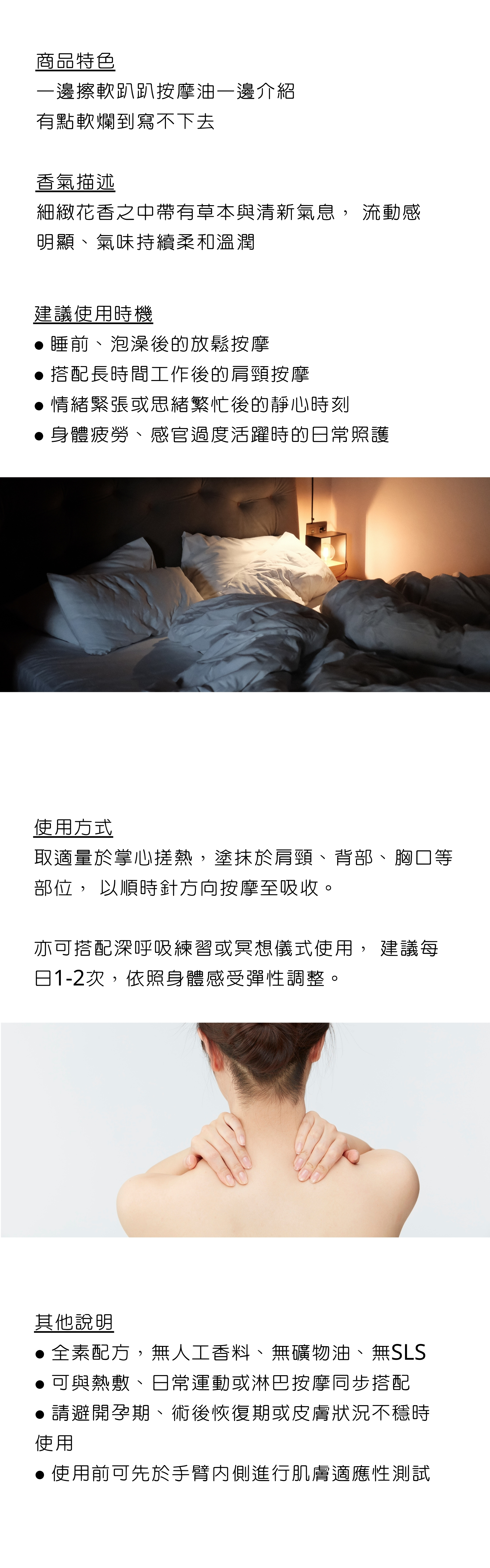 有時候不需要被推動,只需要好好癱在自己的節奏裡。這款適合在壓力堆積、疲憊蔓延之後使用,為緊繃肌膚帶來潤澤,為鬆弛的身體開啟休息的入口。