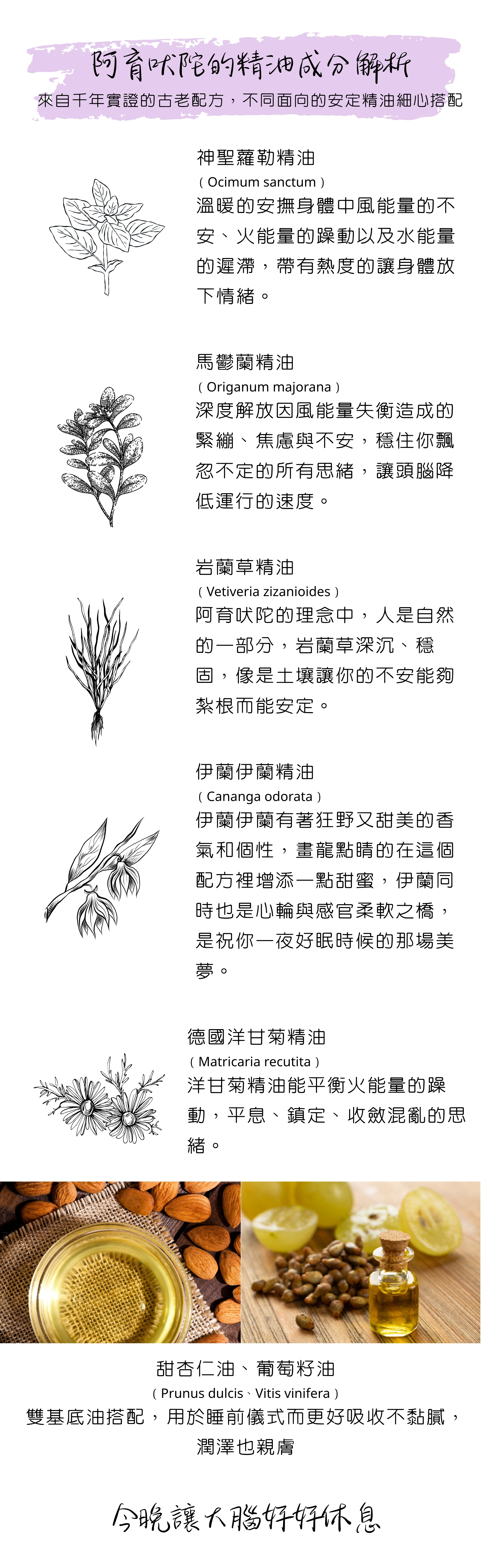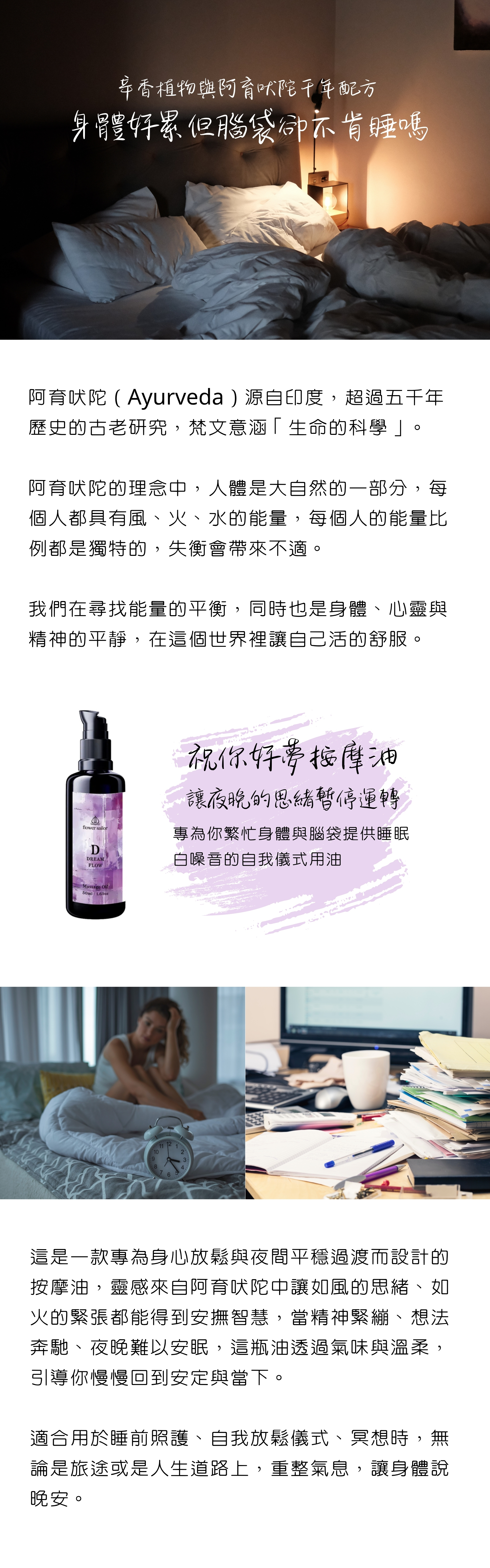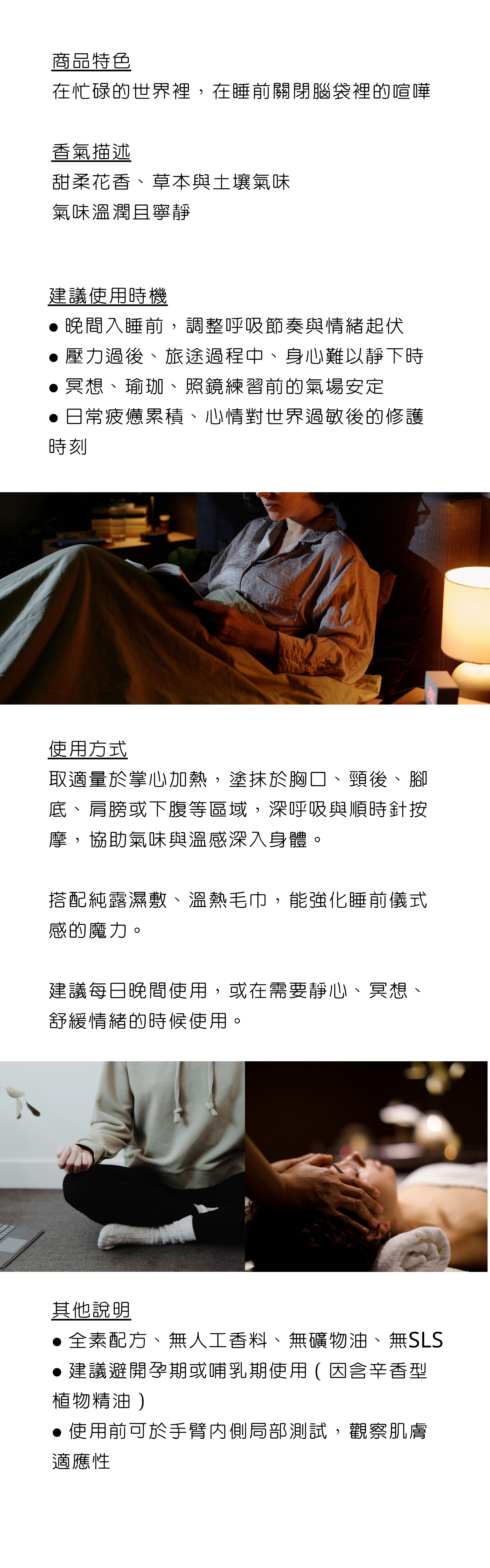 當夜深人靜、思緒仍盤旋不休時,這款配方以柔和氣息安穩心神。適合在睡前使用,讓你慢慢沉入夢境之前,與自己溫柔道晚安。
