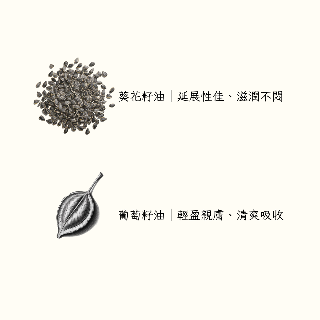 基底油 選擇葵花籽油與葡萄籽油,分別帶來深層潤澤與清爽滲透感,讓配方穩定卻不厚重。