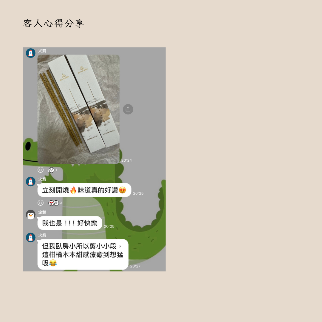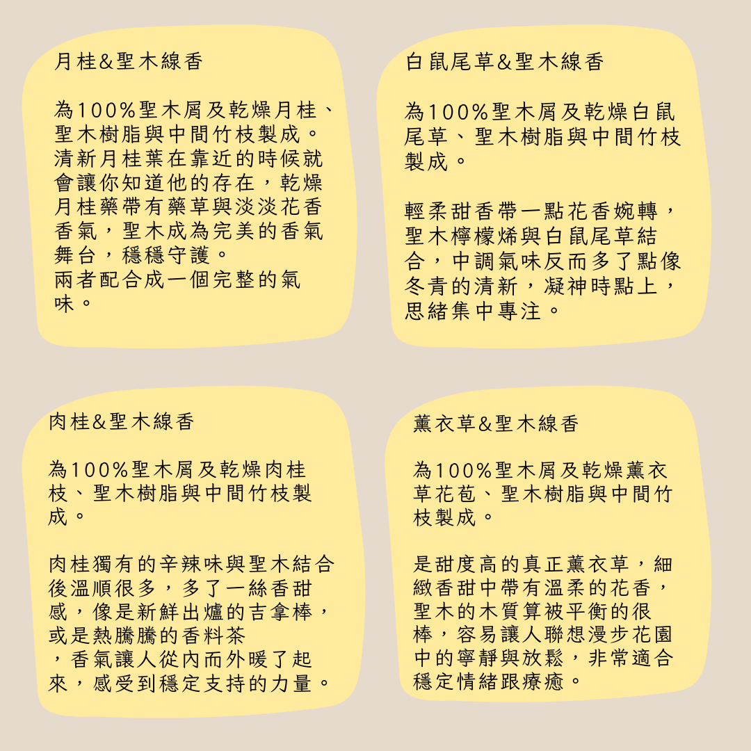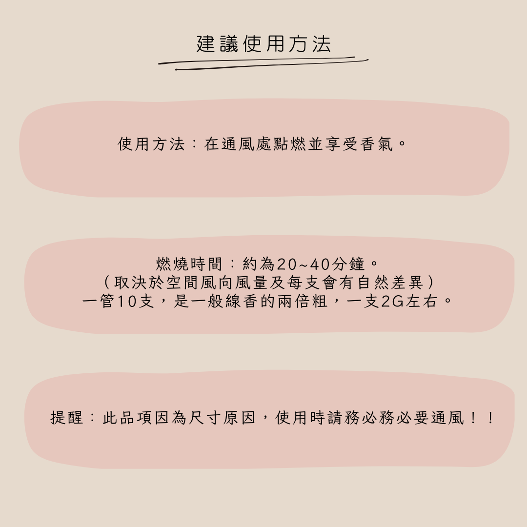 燃燒時間:約為20~40分鐘(取決於空間風向風量及每支之自然差異)